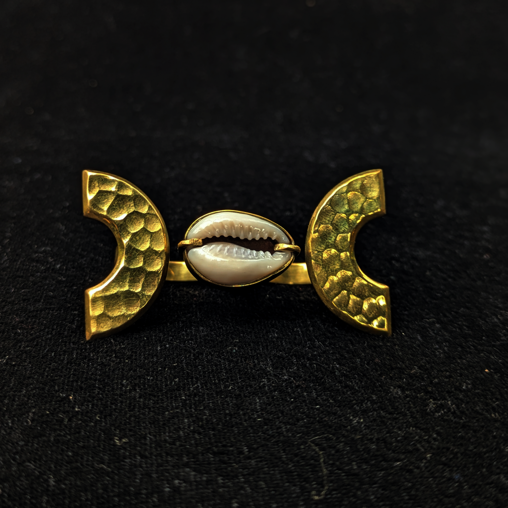 Anchored by a sacred cowrie shell, a symbol of life, femininity, and ancestral wealth, the ring is framed by two crescent moons.